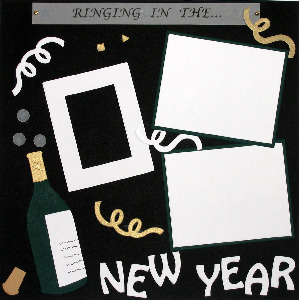 | 12 x 12 black background, "ringing in the new year" title in clear vellum, white "new year" die cur title, champagne bottle and cork, white and gold confetti, clear vellum bubbles, 1 white repositionable frame and 2 white with dark green backing repositionable photo mats |
