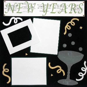12 x 12 black background, white "new years" title with 4 gold brads, clear vellum bubbles, clear vellum glass, white and gold confetti, 1 white repositionable frame and 2 white with dark green backing repositionable photo mats