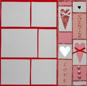 | 12 x 12 red background, red and pink check border, 1 small pink strip, white box with pink & red check heart with white ribbon, pink box, white box with silver heart, pink "love" box, white box with metal heart brad, pink "valentine" box, white box with pink heart and red ribbon, pink box with 3 small pink & red check hearts and white ribbon, small white strip, 6 white repositionable photo mats |