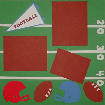 12 x 12 green background with 20, 30 & 40 yard lines, die cuts of red and blue helmets and 2 footballs, "football" pennant title, 3 repositionable brown photo mats