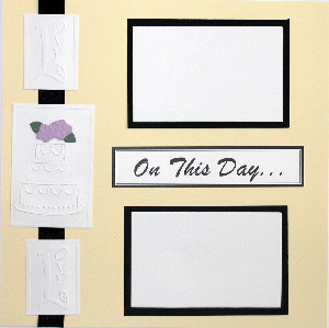 12 x 12 cream background, black ribbon, 2 "love" embossed squares, 1 square embossed with a wedding cake design, white with black border "on this day" title, 3 white with black border repositionable photo mats