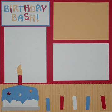 12 x 12 red background, 2 tone yellow stripe border with deckle edge, "birthday bash!" title on white with blue mat, 5 candles, blue and white birthday cake with candle and 3 mini buttons, 2 white and 1 yellow repositionable photo mats