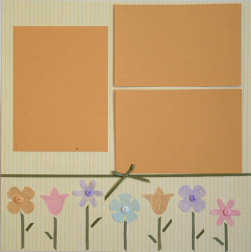 BACKORDER 12 x 12 two tone yellow striped background, 7 mulberry flowers in pastel colors with green ribbon stems (4 flowers with mini button centers), green ribbon strip and bow, 3 dark yellow repositionable photo mats