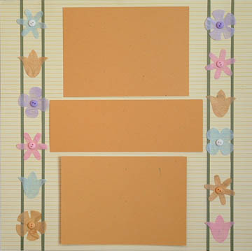 BACKORDER 12 x 12 two tone yellow striped background, 12 mulberry flowers in pastel colors (8 flowers with mini button centers), 4 green ribbon strips, 3 dark yellow repositionable photo mats