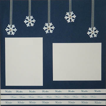 12 x 12 navy background, 5 die cut stars with silver brads hanging from sheer white ribbon, 3 white "winter" title strips, 2 repositionable white photo mats