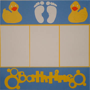 12 x 12 yellow background, blue strip with "bathtime" title, blue strip with 2 yellow ducks, feet die cuts, 3 repositionable white photo mats