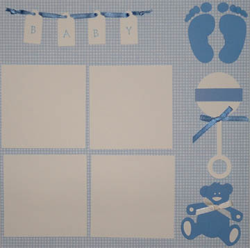 12 x 12 blue and white checked background, bear die cut with white ribbon, rattle with blue ribbon, and feet die cuts, tags spell out "baby" and are attached to a blue ribbon, 4 repositionable white photo mats