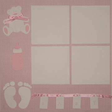 12 x 12 pink and white checked background, bear die cut with pink ribbon, bottle, and feet die cuts, tags spell out "baby" and are attached to a pink ribbon, 4 repositionable white photo mats