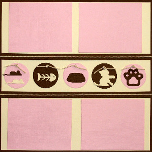 12 x 12 cream background, 4 pale pink photo mats, 2 brown strips with twine, 5 circles with mice, skeleton fish, cat bowl, cat, and paw each with twine knots at the top