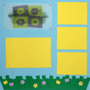 12 x 12 light blue background, green grass border, die cuts of butterflys and flowers with brads, vellum "there's a spring in my step" title with 4 brads over grass, 4 repositionable yellow photo mats