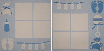 | Baby Boy 1: 12 x 12 blue and white checked background, bear die cut with blue ribbon, bottle and feet die cuts, tags spell out "baby" and are attached to a blue ribbon, 4 repositionable white photo mats. Baby Boy 2: 12 x 12 blue and white checked background, bear die cut with white ribbon, rattle with blue ribbon, and feet die cuts, tags spell out "baby" and are attached to a blue ribbon, 4 repositionable white photo mats |