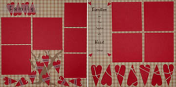 | Family 1: 12 x 12 brown and tan plaid background, 13 red die cut hearts with string, brown tree die cut, vellum family titles, 6 red repositionable photo mats. Family 2: 12 x 12 brown and tan plaid background, 7 red die cut hearts wrapped with string, vellum "families are tied together with heart strings" title with 4 small red hearts in corners, 4 red repositionable photo mats. |