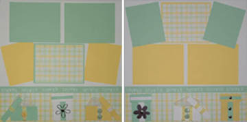 Shower 1: 12 x 12 white background, sea foam green and yellow plaid border, sea foam green "shower" strip, sea foam green gift box with white tissue paper, yellow ribbon and yellow button, white gift box with sea foam green stripe and silver flower attached with a silver brad, yellow gift box with white tissue paper, white ribbon and 2 sea foam green buttons, 2 sea foam green and 2 yellow repositionable photo mats, and 1 yellow and sea foam green plaid with sea foam green backing repositionable photo mat. Shower 2: 12 x 12 white background, sea foam green and yellow plaid border, sea foam green "shower" strip, sea foam green gift box with white stripe and silver flower attached with a silver brad, white gift box with yellow ribbon, white tissue paper and 2 sea foam green buttons, yellow gift box with sea foam green srtipe and 3 silver brads, 2 sea foam green and 2 yellow repositionable photo mats, and 1 yellow and sea foam green plaid with sea foam green backing repositionable photo mat.