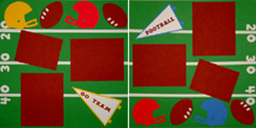 Football 1: 12 x 12 green background with 20, 30 & 40 yard lines, die cuts of red and yellow helmets and 2 footballs, "go team" pennant title, 3 repositionable brown photo mats. Football 2: 12 x 12 green background with 20, 30 & 40 yard lines, die cuts of red and blue helmets and 2 footballs, "football" pennant title, 3 repositionable brown photo mats.