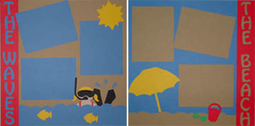 | Beach 1: 12 x 12 tan background, red border with "the waves" title die cut, blue water die cut with 2 yellow fish, yellow sun die cut and scubba diver die cut, 3 blue repositionable photo mats. Beach 2: 12 x 12 blue background, red border with "the beach" title die cut, tan sand border die cut, yellow umbrella, green shovel and red pail die cuts, 3 tan repositionable photo mats. |
