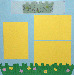 | 12 x 12 light blue background, green grass, die cuts of butterflys and flowers with brads, vellum "spring has sprung" title with 4 brads over grass, 4 repositionable yellow photo mats |