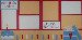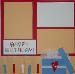 | 12 x 12 red background, 2 tone yellow stripe border with deckle edge, "birthday bash!" title on white with blue mat, 5 candles, blue and white birthday cake with candle and 3 mini buttons, 2 white and 1 yellow repositionable |