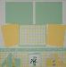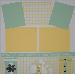 | 12 x 12 white background, sea foam green and yellow plaid border, sea foam green "shower" strip, sea foam green gift box with white tissue paper, yellow ribbon and yellow button, white gift box with sea foam green stripe and |